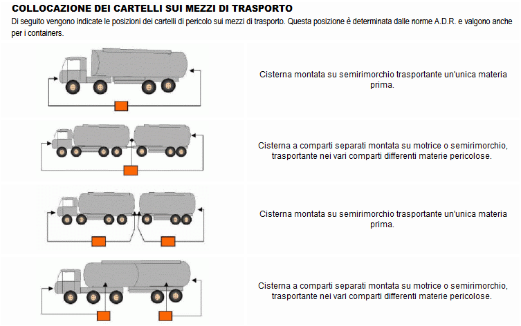 Detti pannelli devono essere collocati in modo ben visibile sia anteriormente che posteriormente al veicolo. Nel caso di veicoli cisterna costituiti da più scomparti, i pannelli sono collocati lateralmente su ogni scomparto, mentre anteriormente e posteriormente al veicolo vanno collocati pannelli analoghi ma senza numero.