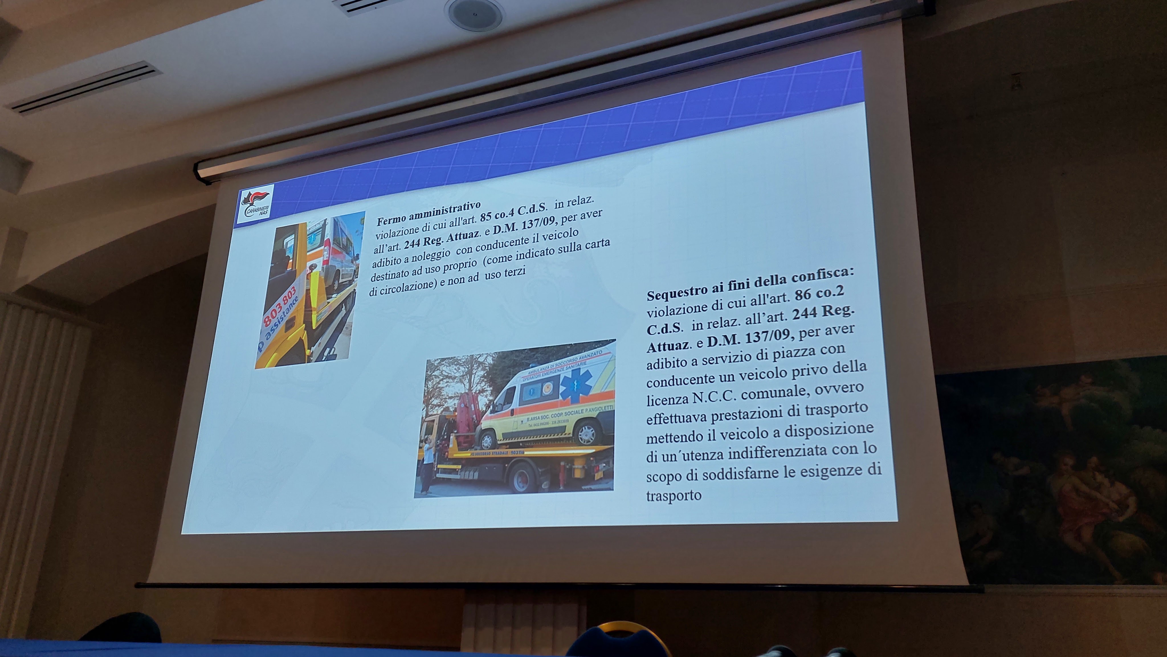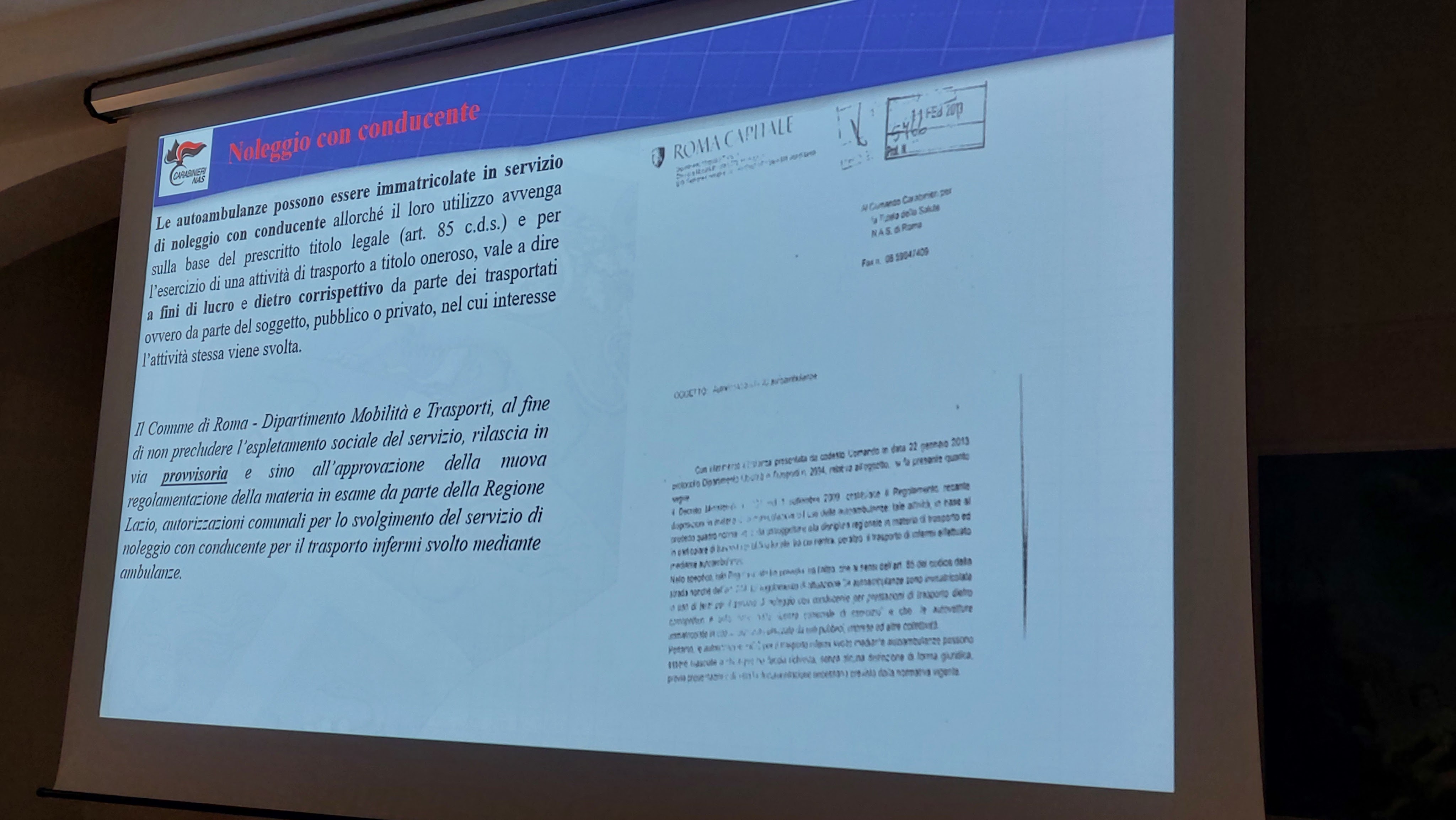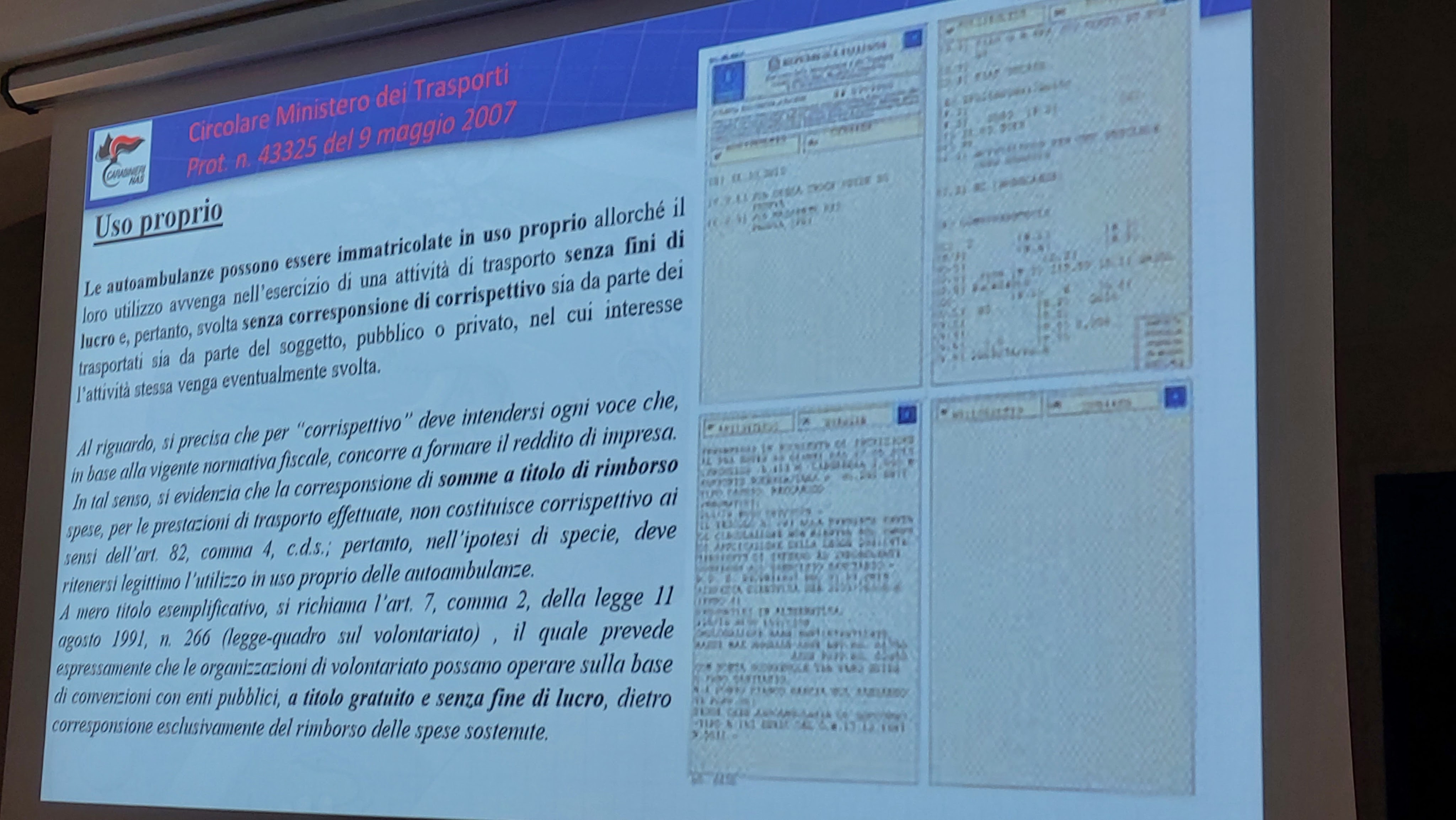 Normative, circolari, protocolli con particolare riferimento alle “regole” autorizzative del traporto infermi, requisiti tecnici dei veicoli, attrezzature, controllo materiali, presidi e farmaci di bordo, vigilanza, responsabilità, violazioni, sono state esplicate inoltre le modalità di come avvengono i controlli da parte delle forze dell’ordine.