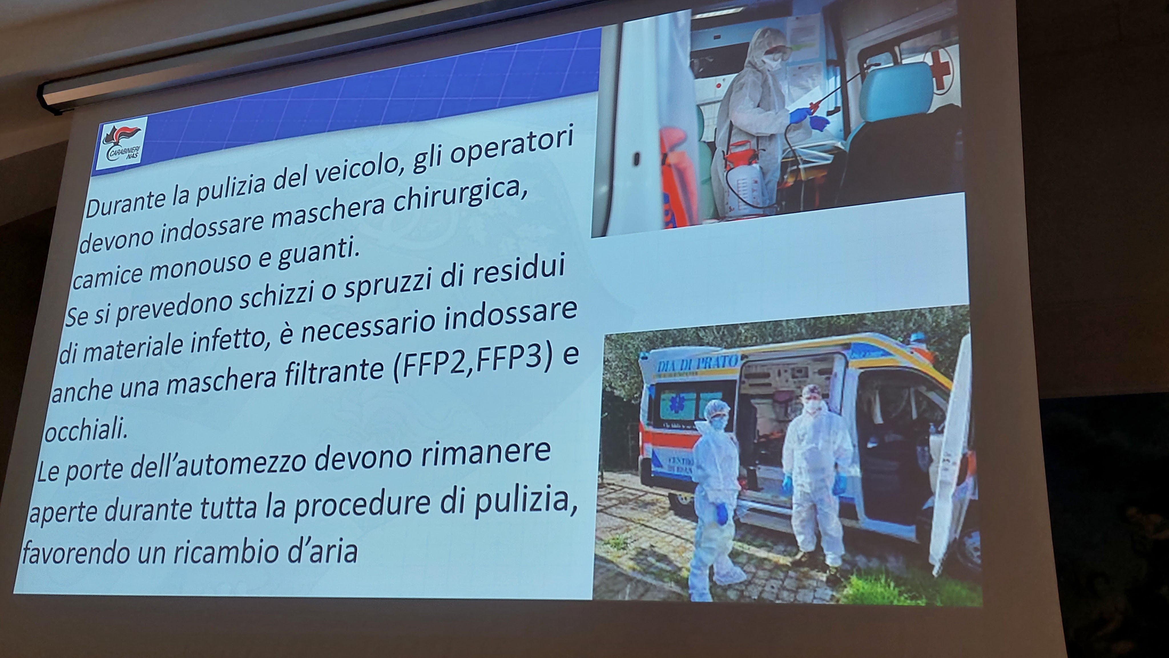 (mancanza di protocolli e di idonee procedure di pulizia e sanificazione dei vani dei mezzi sanitari (in 16 casi) e di mancato possesso ed uso di dispositivi di protezione individuale, come mascherine, guanti e camici monouso, a volte privi di certificato di conformità o smaltiti in modo irregolare (13 episodi).