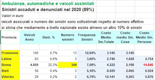 Nella nostra regione sono stati denunciati 365 sinistri, solo su Roma e provincia 344, su Frosinone 13, Latina 3, Rieti 3 e Viterbo 2. La frequenza di sinistro su Roma e provincia si attesta sul 7,08% leggermente superiore che su scala nazionale, il costo medio sinistro (risarcimento persone dove ci sono stati feriti coinvolti) è di circa 15.000 euro invece il costo medio per sinistro totali è di 4.300 euro