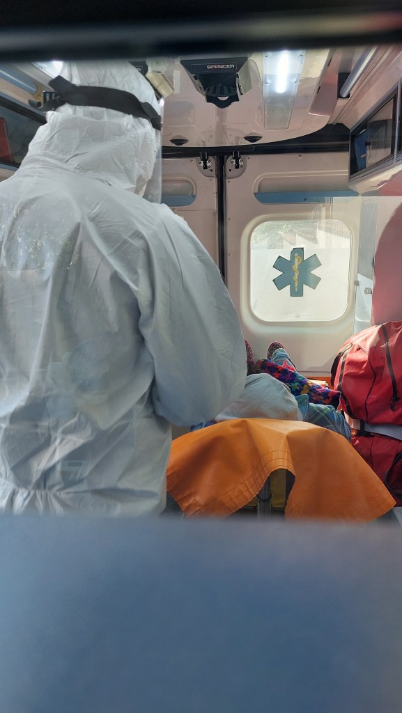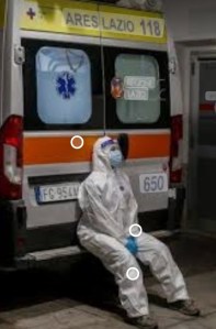 Cosa stara' pensando l'operatore ritratto nell'immagine, probabilmente esausto, seduto sul posteriore dell'ambulanza?