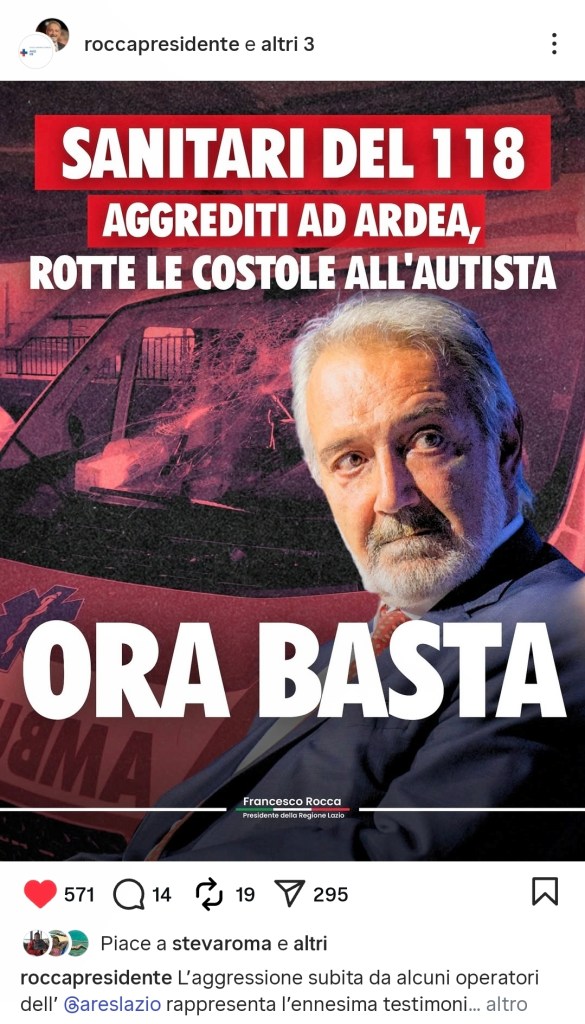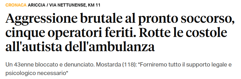 Un grave episodio di violenza è avvenuto ai danni del personale ARES 118 presso il pronto soccorso dei Castelli Romani, dove un paziente particolarmente agitato ha aggredito brutalmente gli operatori in servizio, di cui cinque sono rimasti feriti: tra questi, l’autista dell’ambulanza ha riportato fratture alle costole con 30gg di prognosi, altri operatori di supporto, infermieri e medici danni e contusioni significative con prognosi dai 20gg ai 7gg.